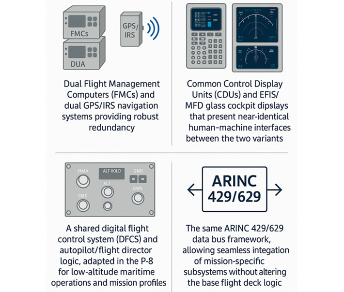The Boeing P-8A Poseidon, derived from the commercial 737-800NG airframe, represents one of the most successful examples of a civil-to-military platform adaptation in modern aerospace. Although externally reinforced and mission-equipped for maritime patrol, reconnaissance, and anti-submarine warfare, the aircraft retains a remarkable degree of avionics and systems commonality with its civil predecessor — a factor that has been central to its cost efficiency, certification maturity, and ease of fleet integration.