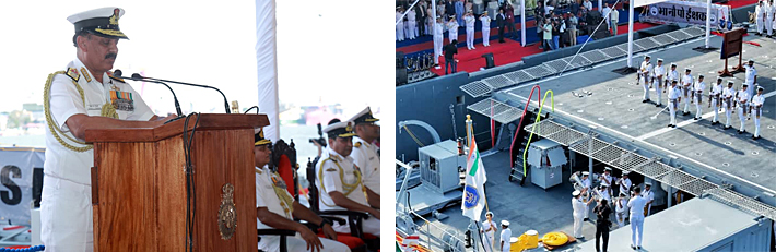 The commissioning ceremony commenced with the reading of the ship's Commissioning Warrant by Captain Tribhuvan Singh, the Commanding Officer. Thereafter, the Naval ensign was hoisted accompanied by the national anthem and a ceremonial salute by the 'Colour Guard' proudly presented by the crew. Simultaneously, the ship's commissioning pennant was also hoisted, signifying its induction into active Naval service. The pennant will remain aflutter till the time the ship remains in commission. The Commissioning Plaque was unveiled by the CNS.