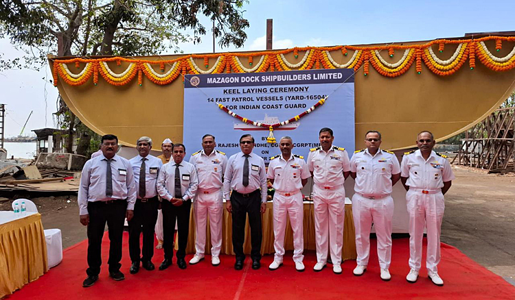 Keel laying ceremony for Fast Patrol Vessel-4 (FPV) (Yard 16504) along with plate cutting ceremony for FPV-7 (Yard 16507) of 14 FPV project (Yard 16501-14) for the Indian Coast Guard was held at Mazagon Dock Shipbuilders Limited (MDL), Mumbai on April 6, 2026.